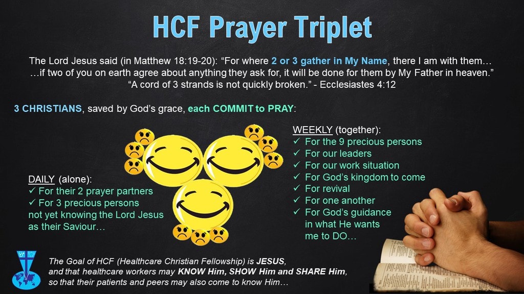 We seek to pray PERSONALLY, to pray PRIVATELY, to pray with our PEERS (as we meet impromptu or in passing; even short “open-eyed” prayers in the corridors), to pray PUBLICLY (in our fellowship meetings or in the cafeteria), to pray privately with PATIENTS (as the Lord leads and allows), to pray with our life PARTNERS (our spouses, if we are married, and with our children, if we have children; including family prayers), to pray with our PARENTS, to pray with our PASTORS (and other elders), to pray in our PRAYER-TRIPLETS (See below please), and to pray during our PENIEL weekends (of special times of meeting and being alone with God)…